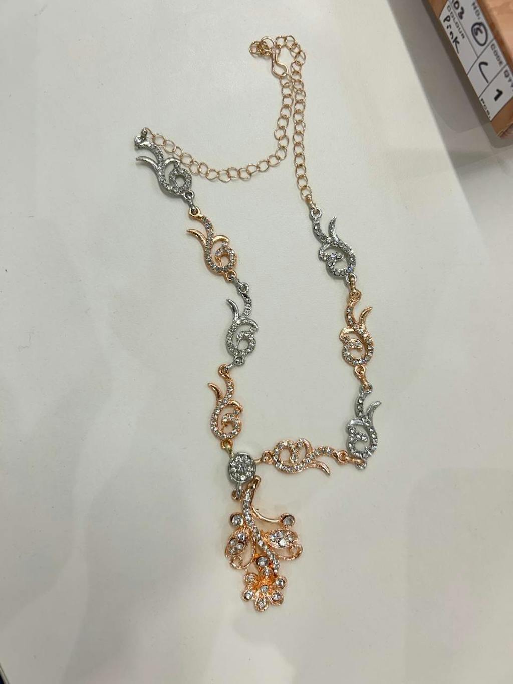 The pendant features shimmering crystal accents arranged in a floral drop pattern, creating a soft sparkle that enhances both ethnic and modern outfits. Completed with matching earrings, this lightweight necklace set is ideal for festive occasions, weddings, parties, and elegant everyday wear.